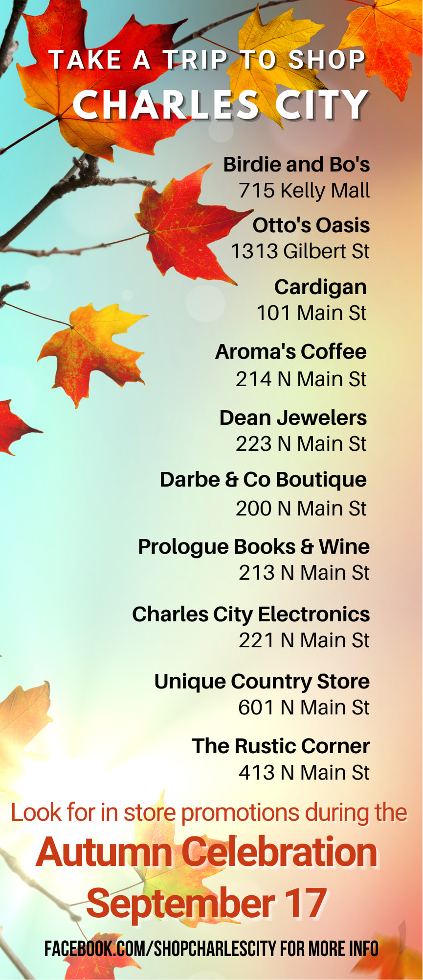 Autumn Celebration Retail Event Back to Search Autumn Celebration Retail Event Saturday, September 17, 2022 (10:00 AM - 4:00 PM) (CDT) Description Autumn Celebration is a retail event showcasing what Charles City's retailers have to offer this season. Look for in store promotions!Check individual stores for hours. Additional Info Images × Event Contact Joanna Thompson Saturday, September 17, 2022 (10:00 AM - 4:00 PM) (CDT) Registered Guests × Share × Print Email Add to Calendar Facebook LinkedIn X Pinterest Powered By GrowthZone
