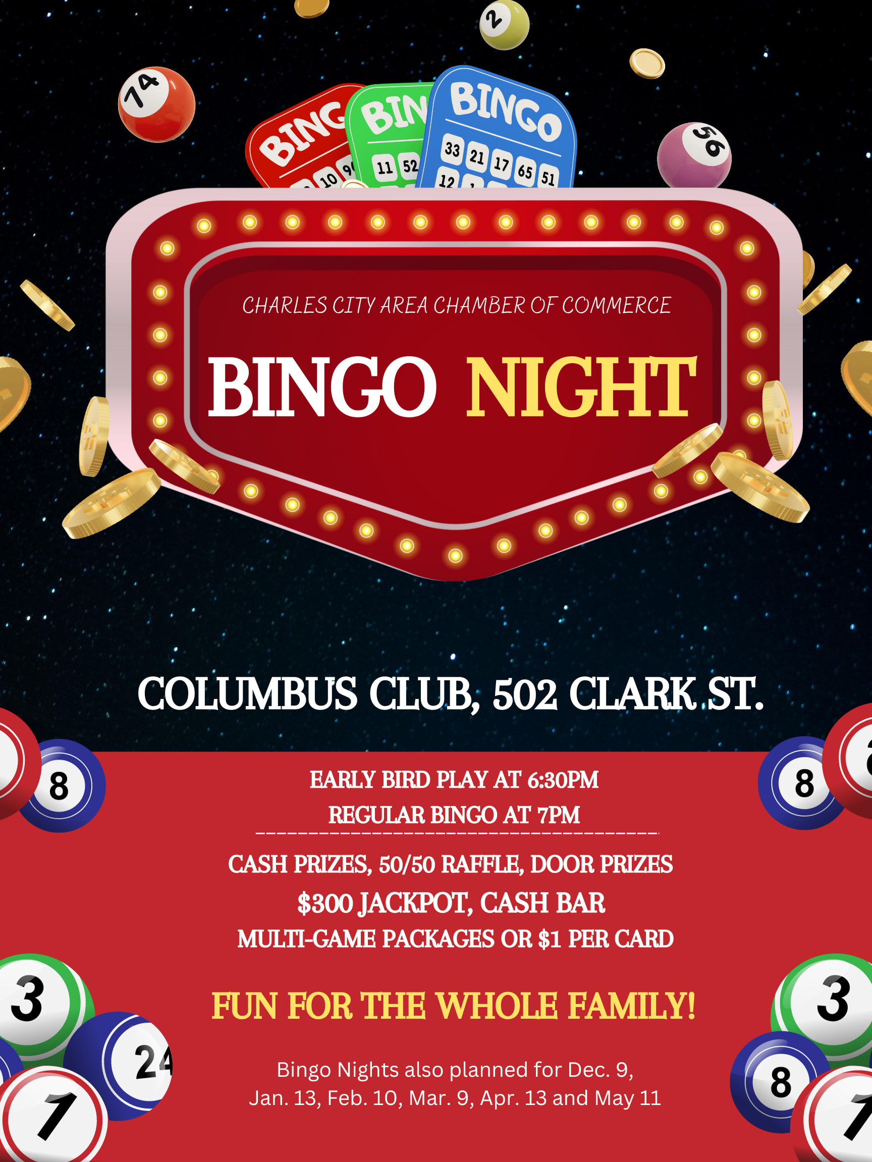 Chamber Bingo Nights will be hosted at the Columbus Club, 502 Clark St., with Early Bird beginning at 6:30 p.m. and regular bingo starting at 7 p.m.