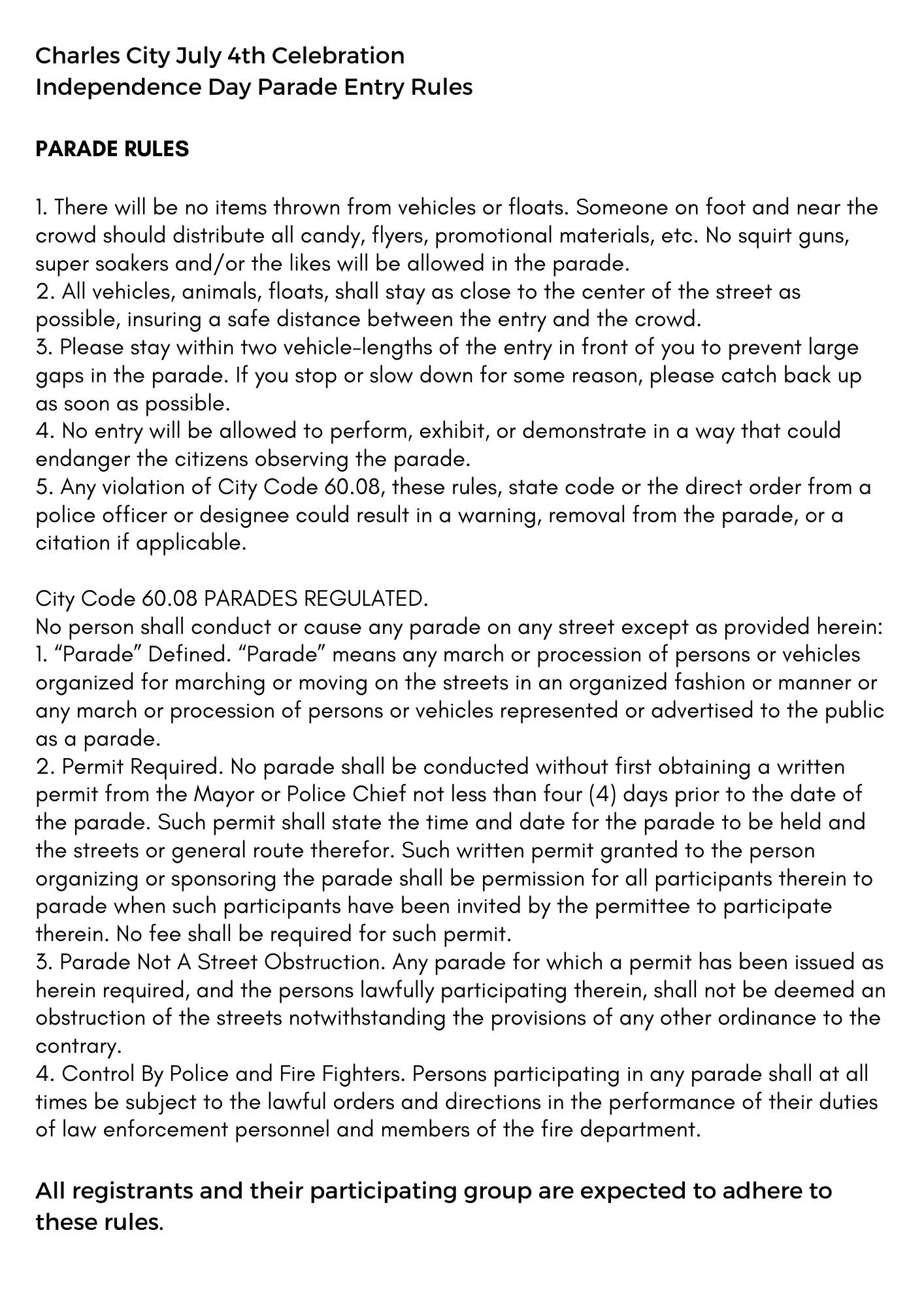 This year's Independence Day Parade in Charles City will feature a new start time (11 a.m.) and slightly different route due to street construction work on North Main Street. Staging will take place on Ferguson Street and the Community Center parking lot.