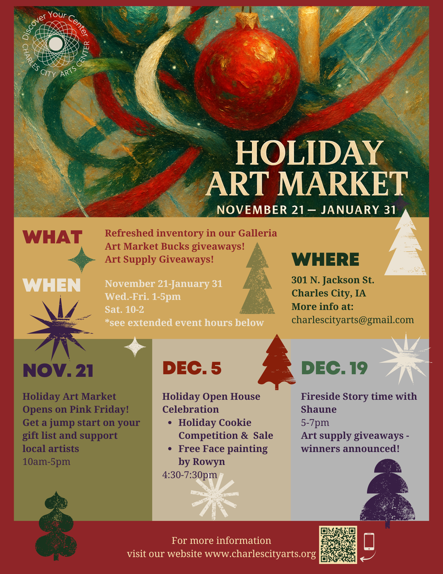 Holiday Art Market: https://www.charlescityarts.org/event-details-registration/holiday-art-market