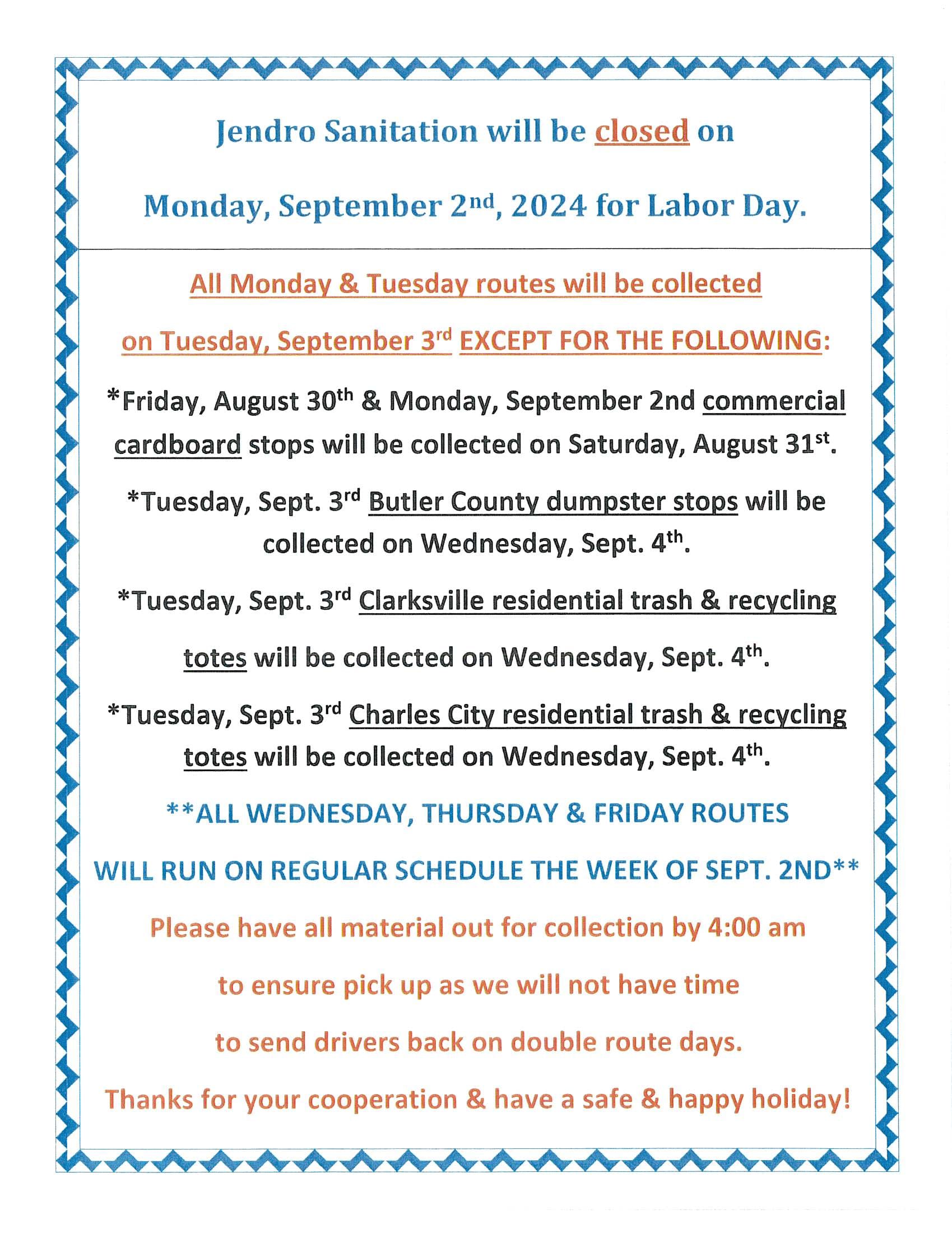All Monday & Tuesday routes will be picked up on Tuesday except for the following: *Friday August 30th & Monday September 2nd, Commercial Card Board Stops will be collected on Saturday August 31. *Tuesday, Sept 3rd Butler County dumpster stops will be collected on Wednesday, Sept 4th. *Tuesday, Sept 3rd Charles City residential and recycling totes will be picked up on Sept 4th. **ALL WEDNESDAY, THURSDAY, & FRIDAY ROUTES WILL RUN ON REGULAR SCHEDULE. PLEASE HAVE ALL MATERIALS OUT FOR COLLECTION BY 4:00 AM TO ENSURE PICK UP AS WE WILL NOT HAVE TIME TO SEND DRIVERS BACK OUT ON DOUBLE ROUTE DAYS. THANKS FOR YOUR COOPERATION & HAVE A SAFE & HAPPY HOLIDAY.Images