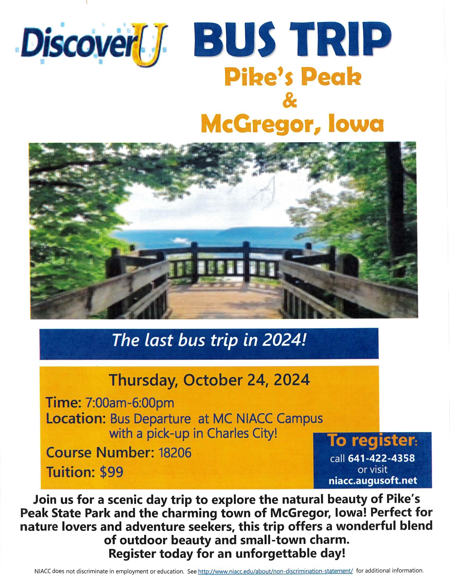 A day trip to explore the natural beauty of Pikes Peak State Park and the Charming town of McGregor IA. Fee $99.00Images