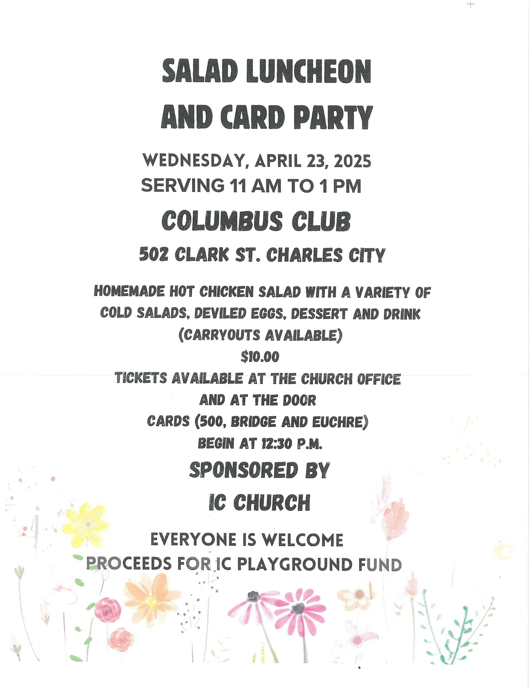Homemade Hot Chicken Salad with a variety of cold salads, deviled eggs, dessert and drink (carryouts available) $10.00 Tickets available at the church office and at the door. Cards (500, Bridge and Euchre begins at 12:30 PM.)Images